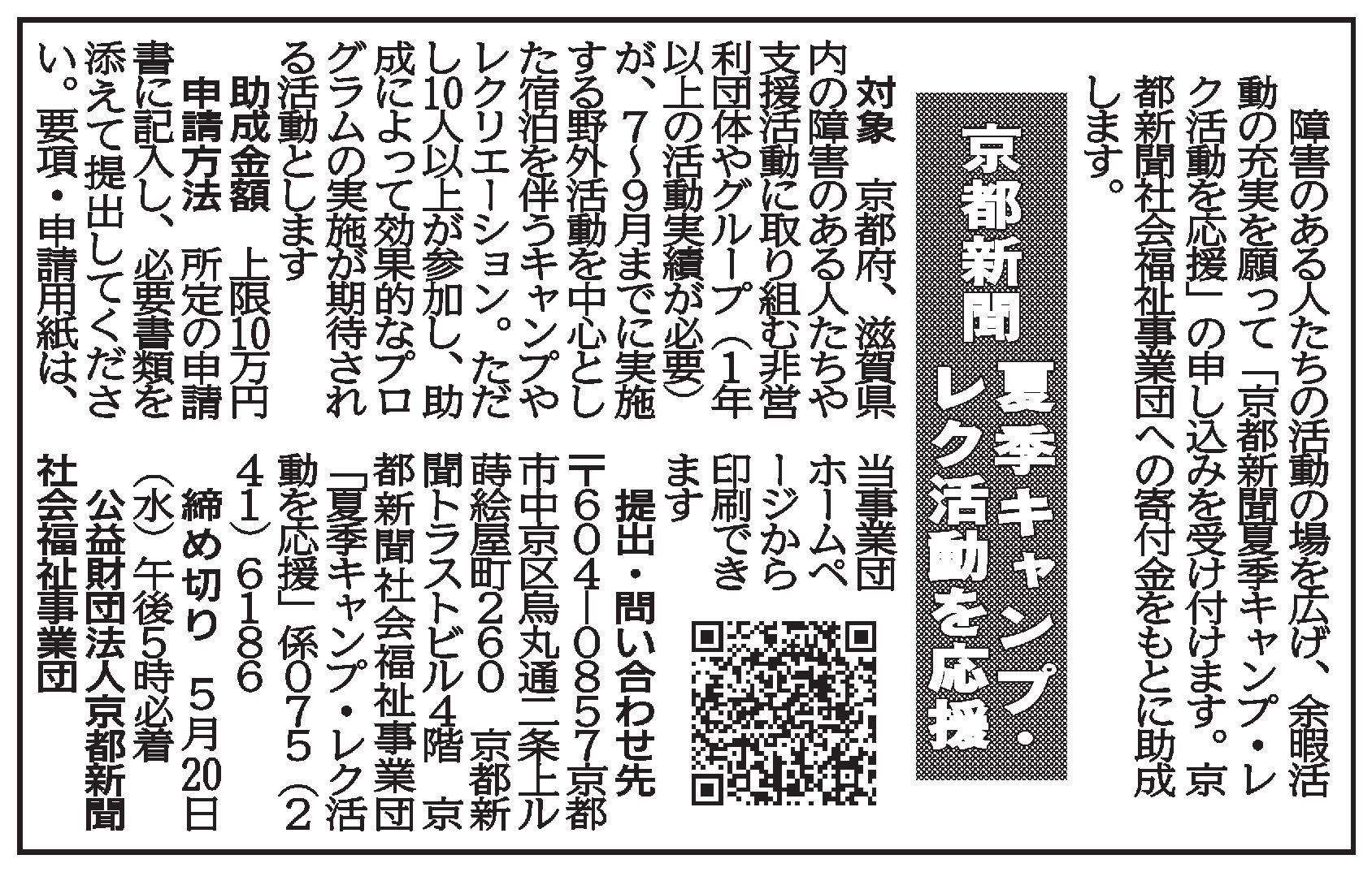 障害のある人たちの活動の場を広げ、余暇活動の充実を願って「夏季キャンプ・レク活動を応援」の申し込みを受け付けます。京都新聞社会福祉事業団への寄付金をもとに助成します。