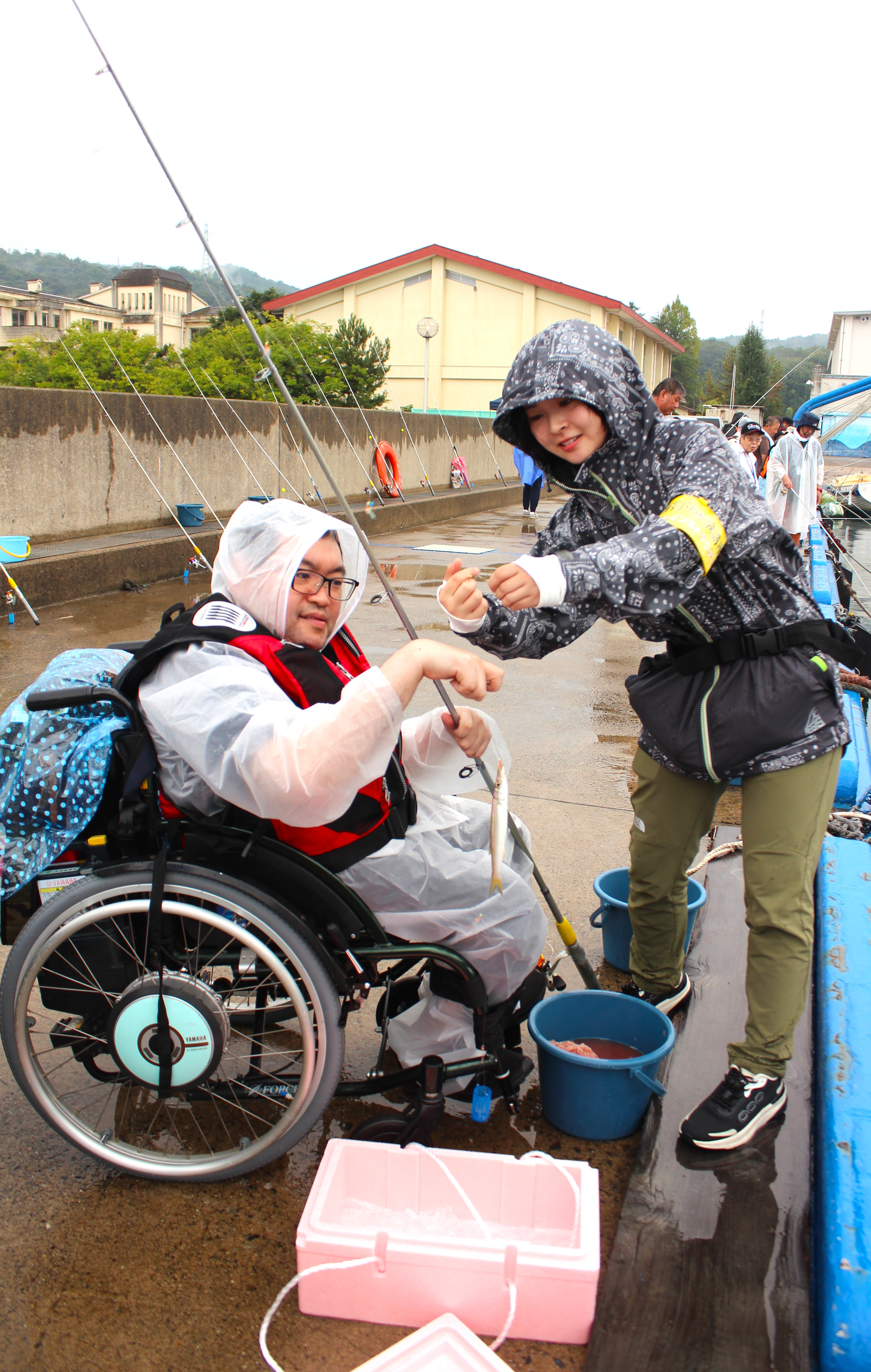 電動車いすに座り雨具をすっぽりかぶって挑戦していた京都市伏見区の土井孝浩さん(40)は何度も参加して慣れた様子。「この程度の雨は気にならない。釣りはやっぱり楽しい」とカマスなどを釣り笑顔だった。山科区から参加の西村宰(つかさ)さん(24)・ちとせさん(62)親子は、ボランティアの手助けで大きなアコウを釣り上げ、重量の部で表彰も。「アジも20匹以上釣れ、釣れた時のわくわく感や手応えがおもしろい」と話した。