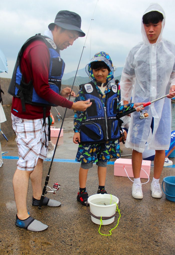 海洋高生と京都府磯釣連合会会員らは、参加者の様子や上がる魚の種類に目を配りながら、餌をつけたり、魚を網ですくって針をはずすなど介助に取り組んだ。