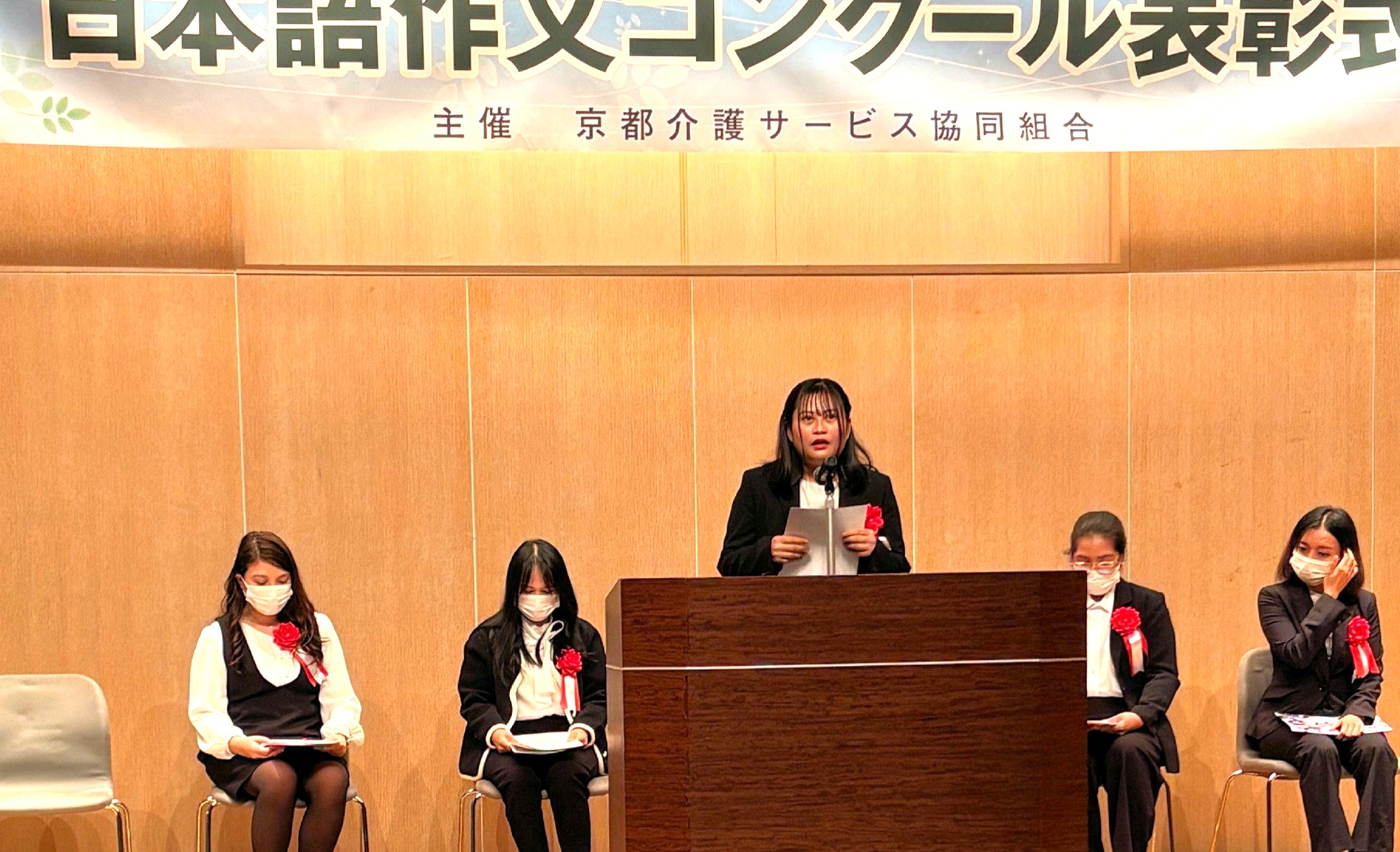 「第6回介護施設で働く外国人による日本語作文コンクール」の表彰式がこのほど、京都市中京区のハートピア京都で行われた=写真。