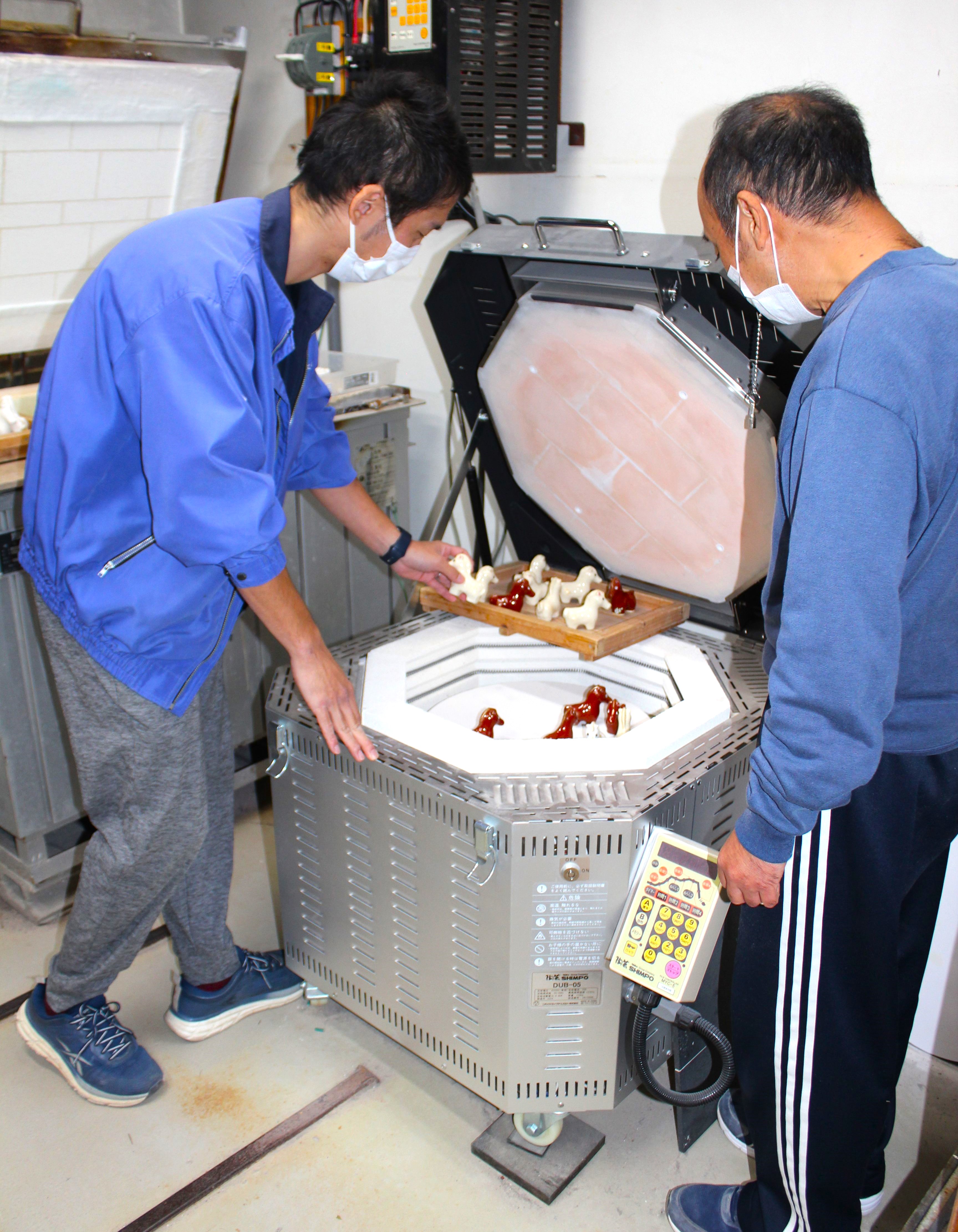 作業は陶芸班の10人が支援員(職員)ら5人とともに、粘土の成形から始まり、乾燥や余分な部分を削り取り、みがき、800度程度の素焼き、下絵つけ、釉薬(ゆうやく)かけ、1200度以上の高温で本焼き、上絵つけ、上絵の焼成など多岐にわたる。技法も、ひも状にした粘土を積み上げるひも作り、板状の粘土を型に押し当てるたたら作り、電動機械ろくろ、石こう型を使って成形する型押しなど多様だ。