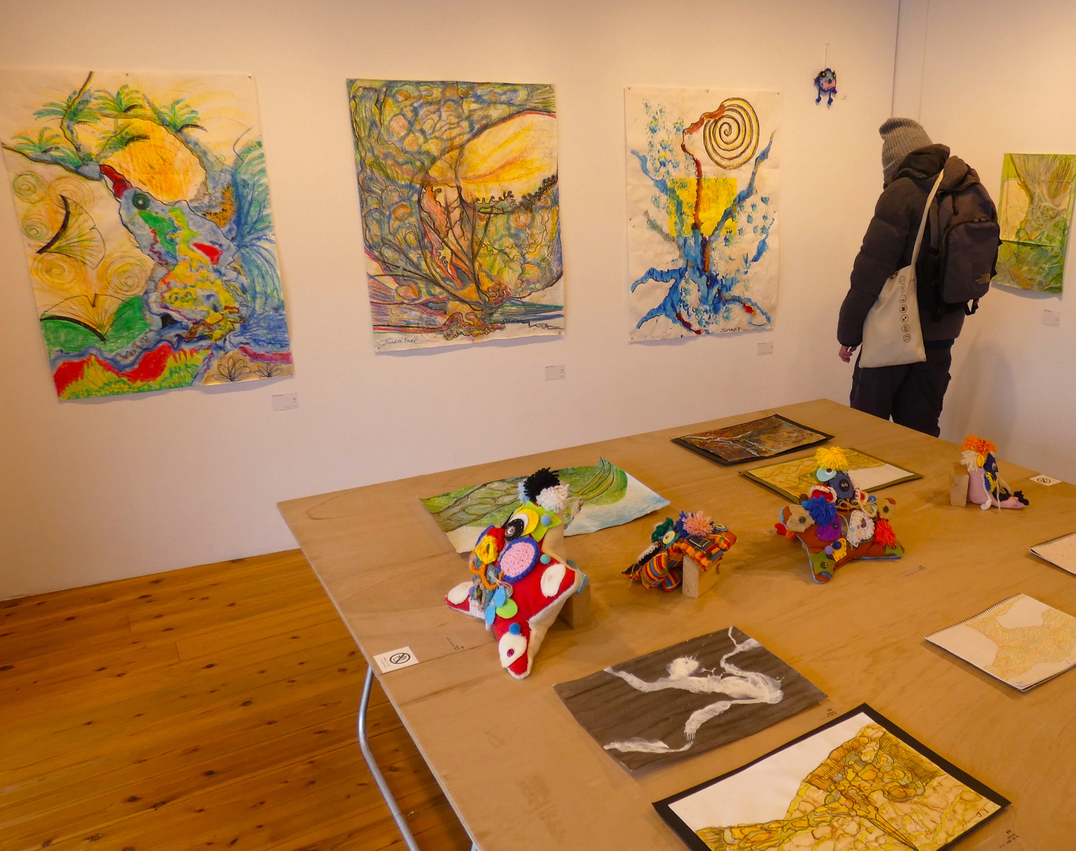 「ファンタジー」と題して色鉛筆やフェルトペン、水彩などで有機的な曲線と幾何学的なパターンが織りなす幻想的な風景や、小さな紙にパステルで山や自然の風景画、独創的な色使いで描いた鳥、やわらかな雰囲気を感じさせる色鉛筆で描いた風景画などが展示されている。いずれの作品も豊かな表現で奥深い世界が広がっている。