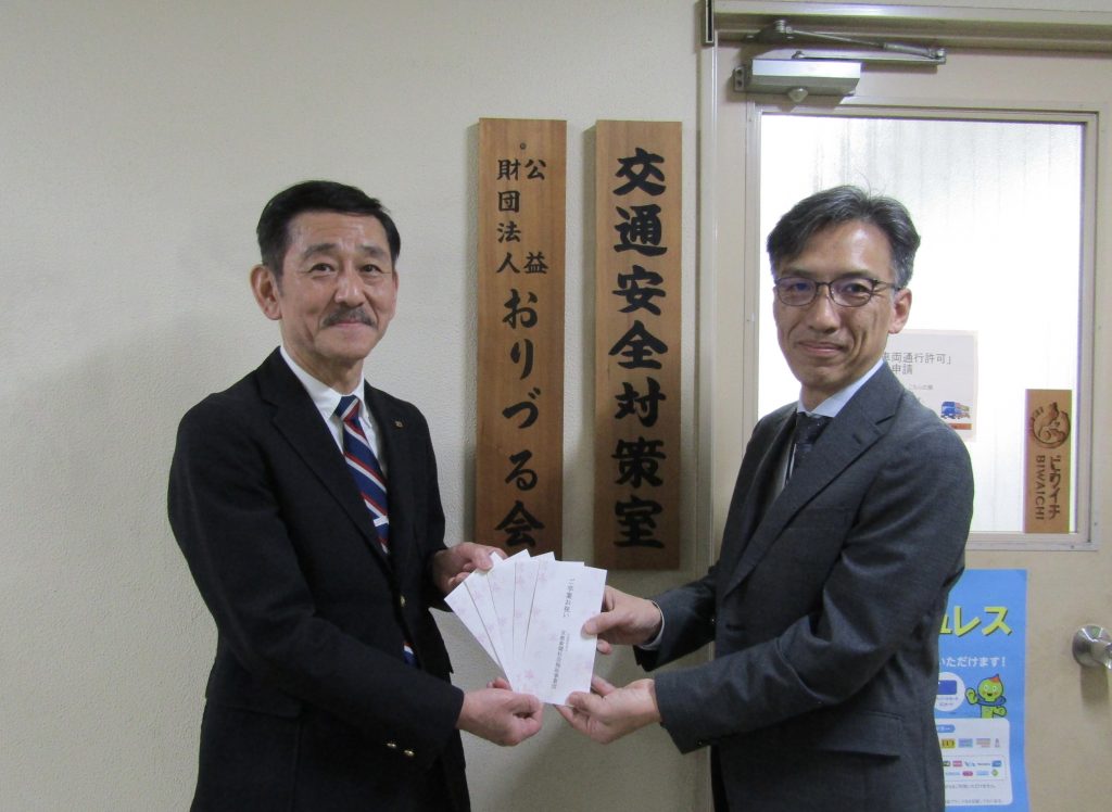 京都府中古自動車販売商工組合青年部会(村上力部会長)が30万円を寄付した=写真。 昨年12月10日(水)に開催したチャリティーオークションでの寄金を「交通遺児のために役立ててください」と村上部会長らが…