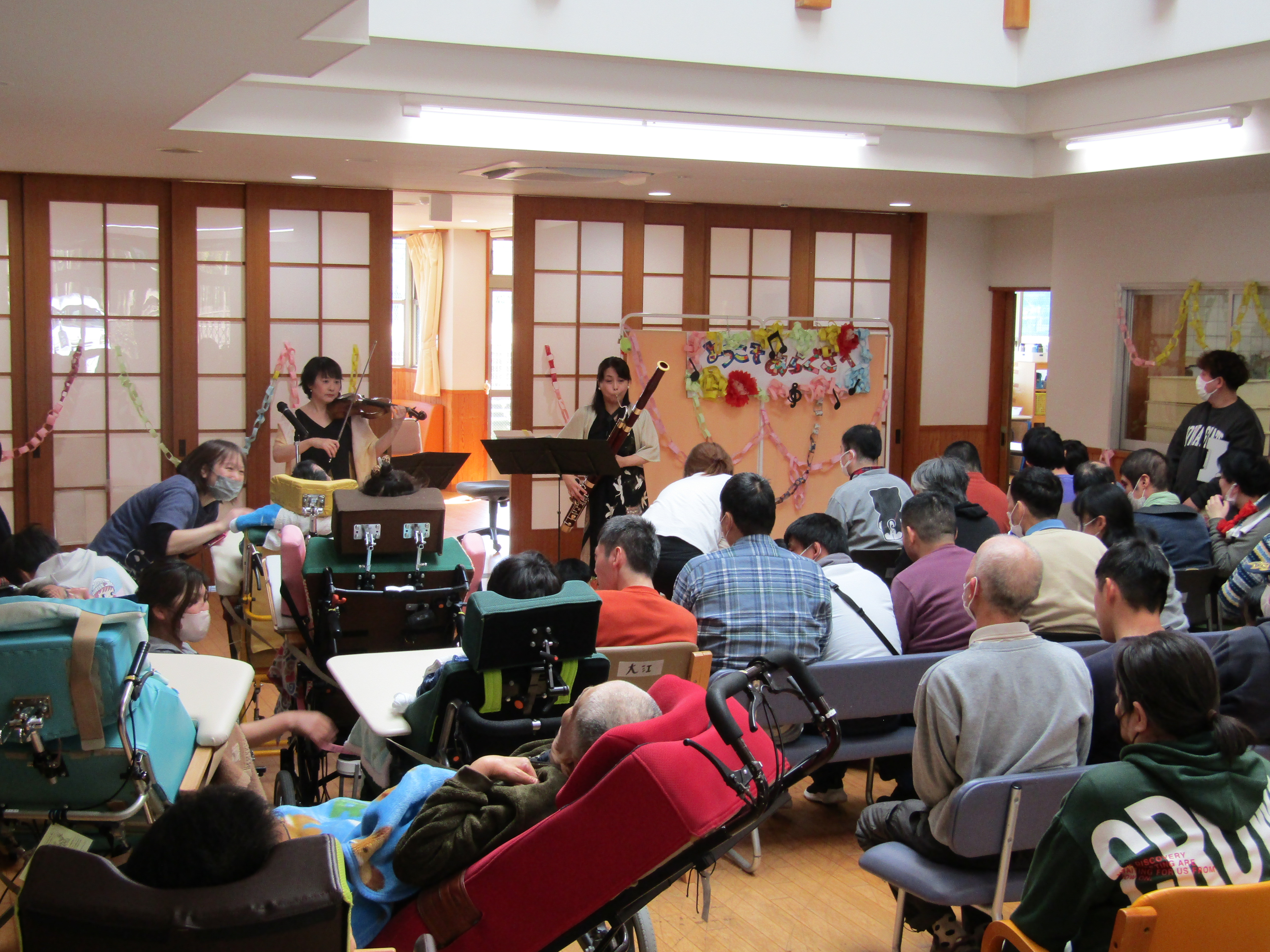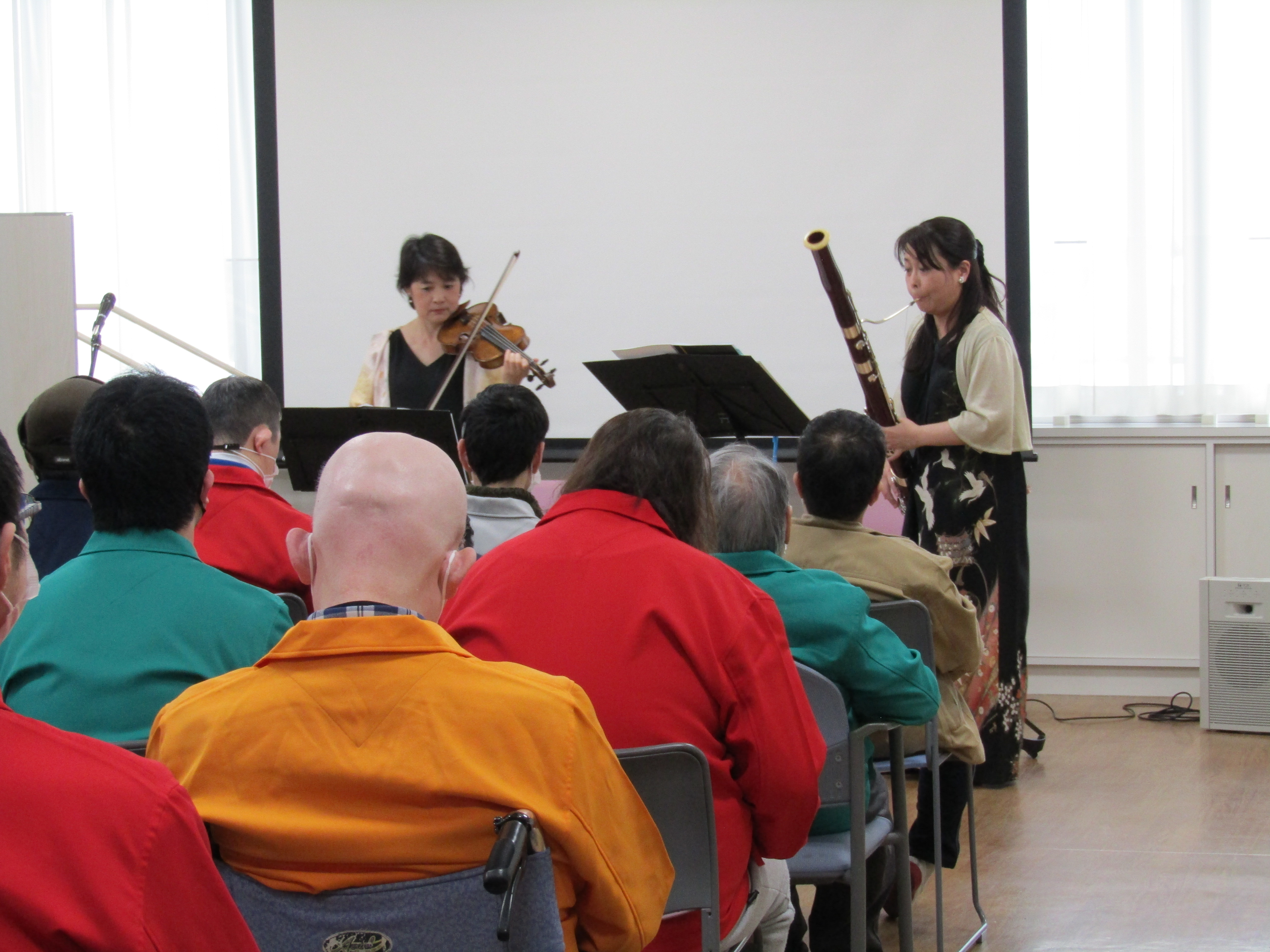 利用者を楽しませたバイオリンとファゴットの奏者2人による演奏会(守山市十二里町、もりやま作業所)