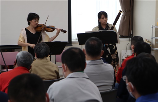 2024年度は、NPO法人京都フィルハーモニー室内合奏団に所属するヴァイオリニストの森本真裕美さんとファゴット奏者の田中裕美子さんの奏者2人に、デュオ演奏によるクラシック音楽や日本の歌メドレーなど約10曲と楽しいトークを披露していただきました。